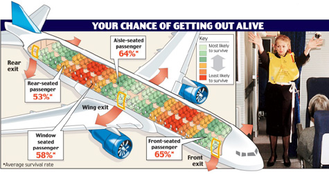 Những chỗ ngồi cạnh lối thoát hiểm thường được coi là an toàn nhất trên máy bay. Năm 2007, tạp chí Popular Mechanics tiến hành nghiên cứu tất cả các vụ rơi máy bay từ năm 1971 để tìm hiểu chỗ ngồi nào trên phi cơ thường có người sống sót. Họ phát hiện những người ngồi phía đuôi máy bay có tỷ lệ an toàn cao hơn. Tỷ lệ sống sót của những người ngồi khu vực này là 69% so với 56 % ngồi ở phần cánh và 49 % ngồi ở phần đầu máy bay.